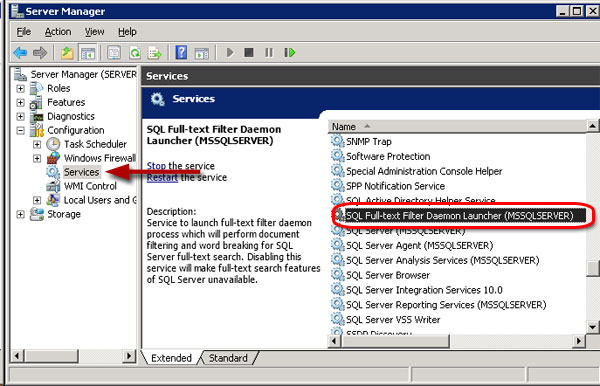 برای Start یا راه اندازی سرویس Full Text Search، از منوی Start روی Computer راست کلیک کرده و گزینه Manage را انتخاب نمایید، بلافاصله پنجره Server Manager نمایان می شود. مطابق شکل زیر از سمت چپ گزینه Services را انتخاب کنید و برای Start یا راه اندازی سرویس Full Text Search روی گزینه SQL Full-text Filter Daemon Launcher کلیک راست کرده و گزینه Start را انتخاب نمایید: