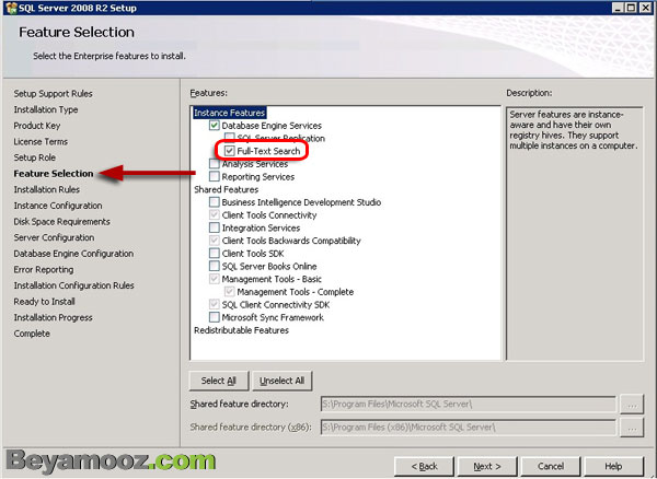توجه: برای استفاده از ویژگی Full-Text Search، باید تیک Full-Text Search را هنگام نصب SQL Server فعال کرده باشید، یعنی مطابق شکل زیر در مرحله Feature Selection، گزینه Full-Text Search فعال شده باشد: